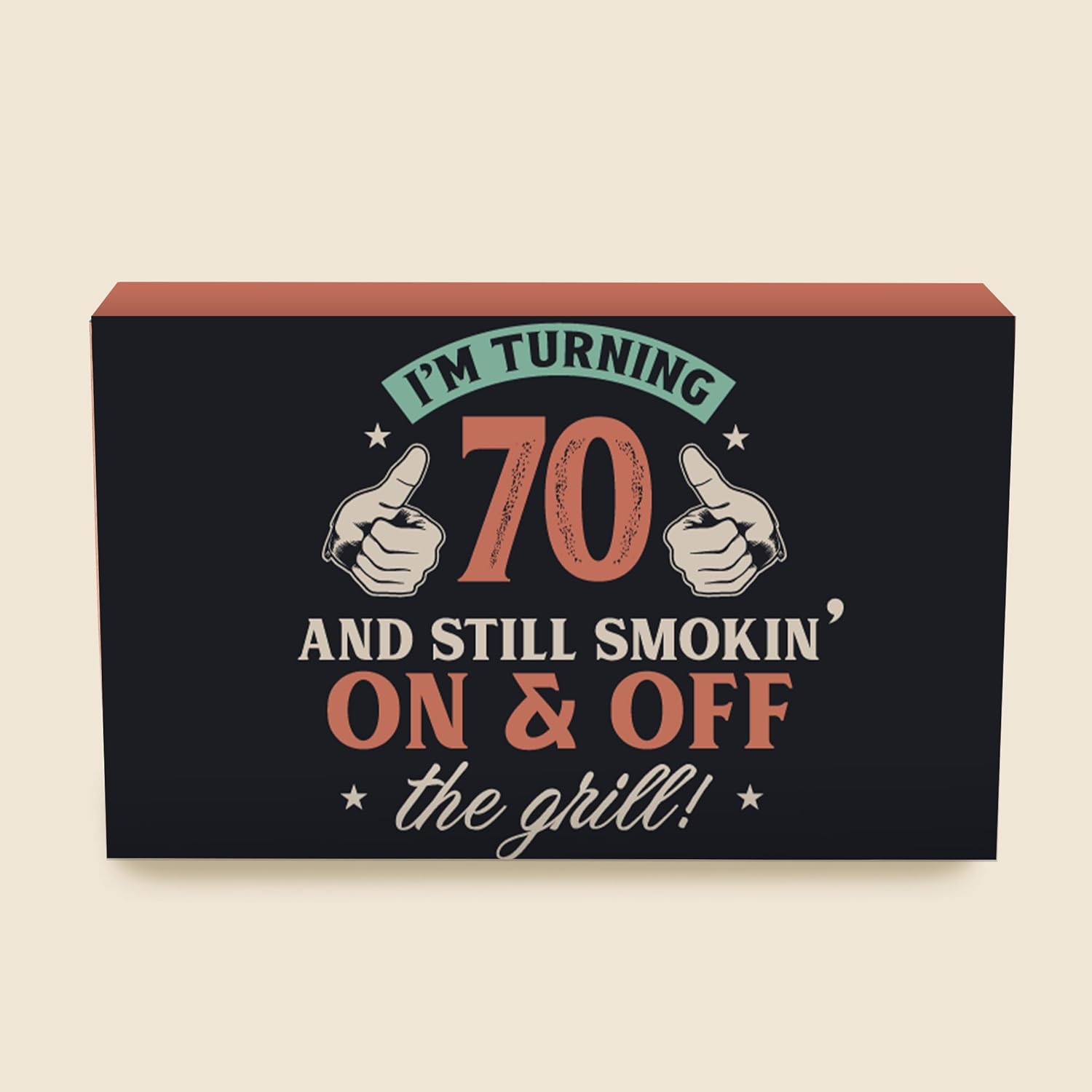 FUN BIRTHDAY MESSAGE – Packaging features the playful phrase “I’m turning 70 and still smokin’ on & off the grill!” for a lighthearted gift.