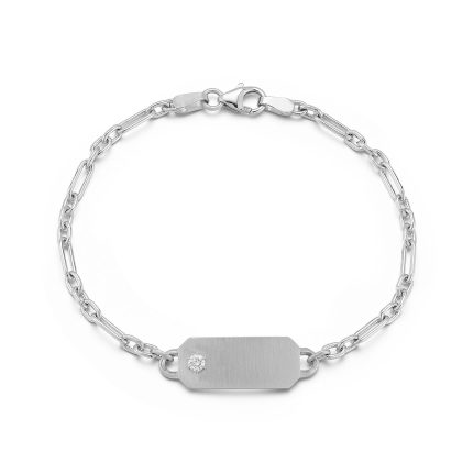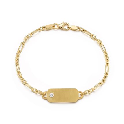 Handcrafted in 18-Karat gold, featuring one round, brilliant-cut diamond, and secured on our Winona Chain, the Betty Tag Bracelet is