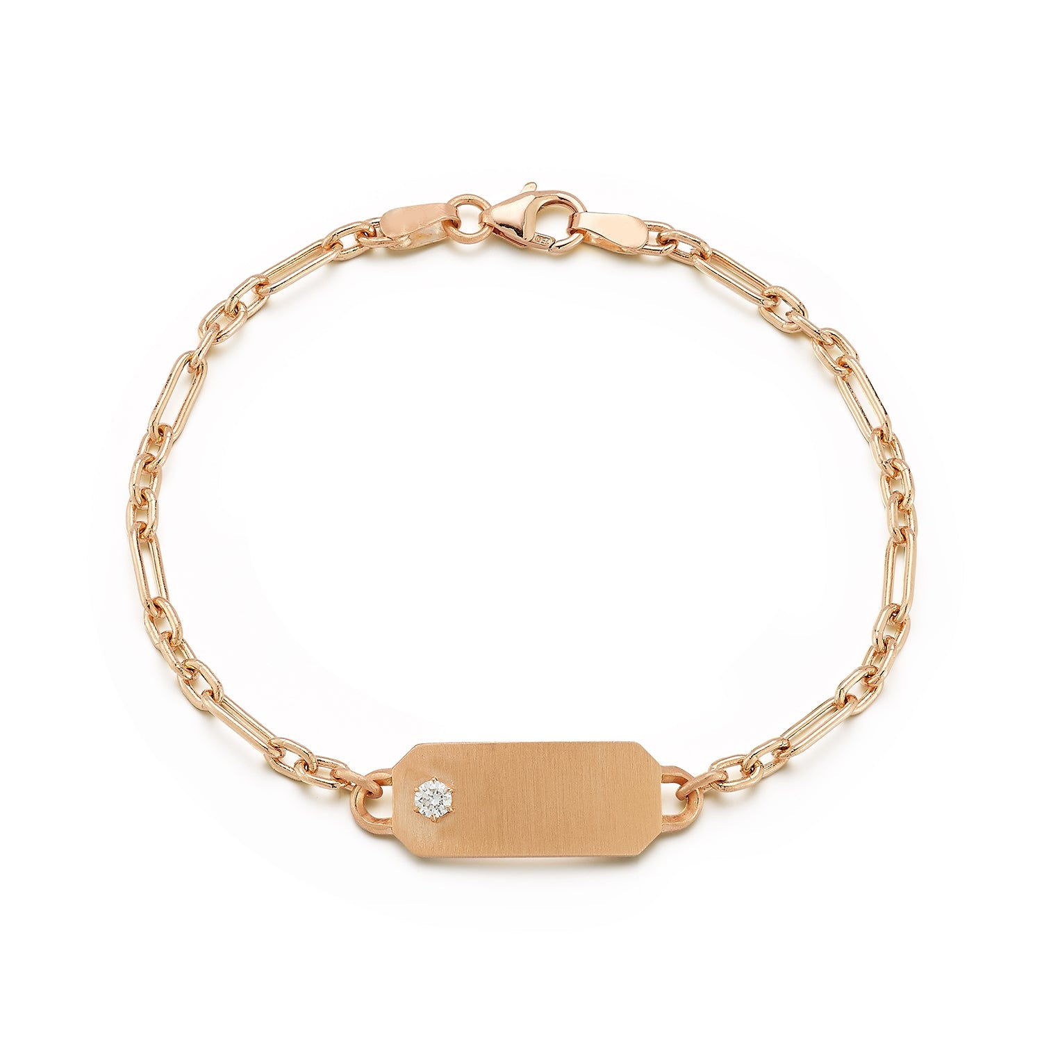 Handcrafted in 18-Karat gold, featuring one round, brilliant-cut diamond, and secured on our Winona Chain, the Betty Tag Bracelet is borrowed from our bestselling Betty Necklace. The Betty Tag Bracelet can be laser engraved to tell your personal story and soldered onto any bracelet or chain in our collection.